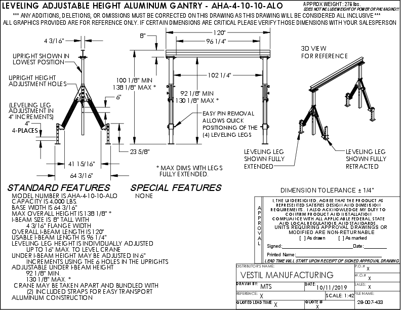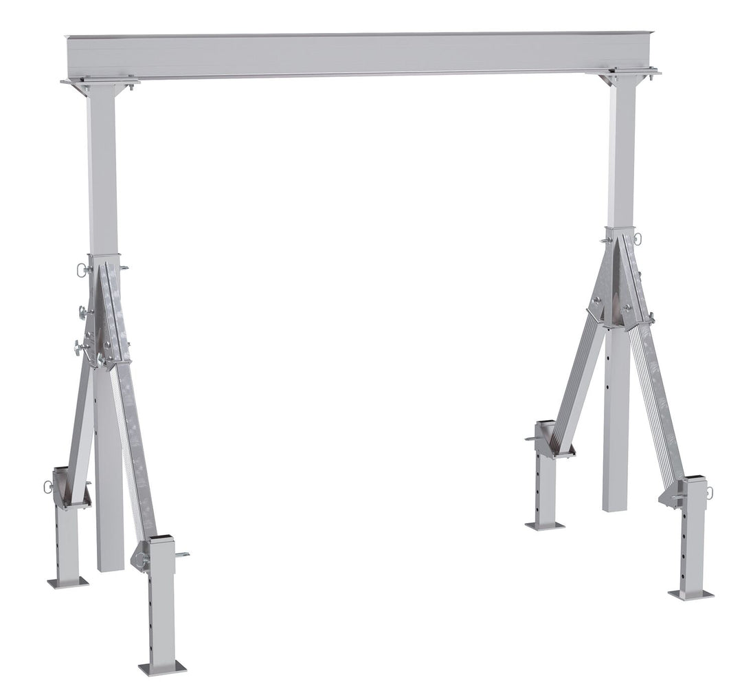 Vestil Aluminum Adjustable Height Gantry Crane With Adjustable Leveling Option 10 Ft. Wide x 10 Ft. Max Usable Height 4,000 Lb. Capacity Silver AHA-4-10-10-ALO