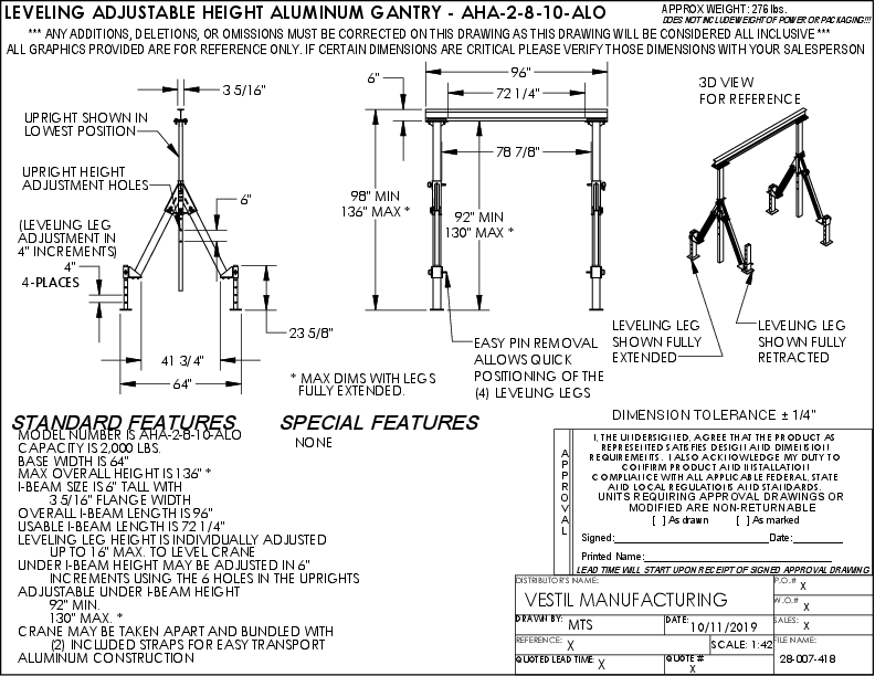 Vestil Aluminum Adjustable Height Gantry Crane With Adjustable Leveling Option 8 Ft. Wide X 10 Ft. Max Usable Height 2,000 Lb. Capacity Silver AHA-2-8-10-ALO