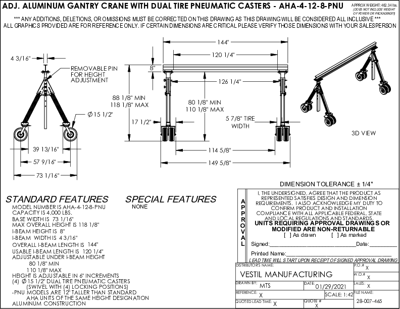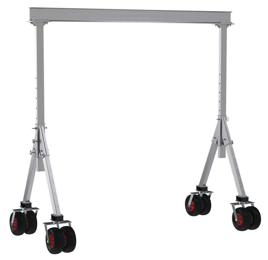 Vestil Aluminum Adjustable Height Gantry Crane with Pneumatic Rubber Casters 12 Ft. Wide x 8 Ft. Max Usable Height 4,000 Lb. Capacity Silver AHA-4-12-8-PNU