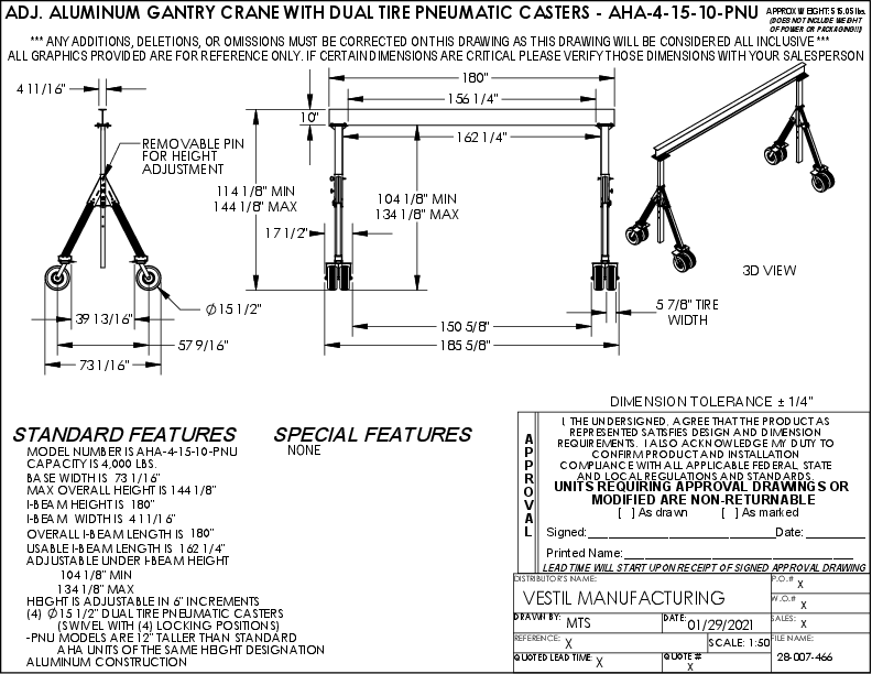 Vestil Aluminum Adjustable Height Gantry Crane with Pneumatic Rubber Casters 15 Ft. Wide x 10 Ft. Max Usable Height 4,000 Lb. Capacity Silver AHA-4-15-10-PNU