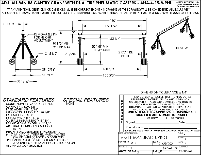 Vestil Aluminum Adjustable Height Gantry Crane with Pneumatic Rubber Casters 15 Ft. Wide x 8 Ft. Max Usable Height 4,000 Lb. Capacity Silver AHA-4-15-8-PNU