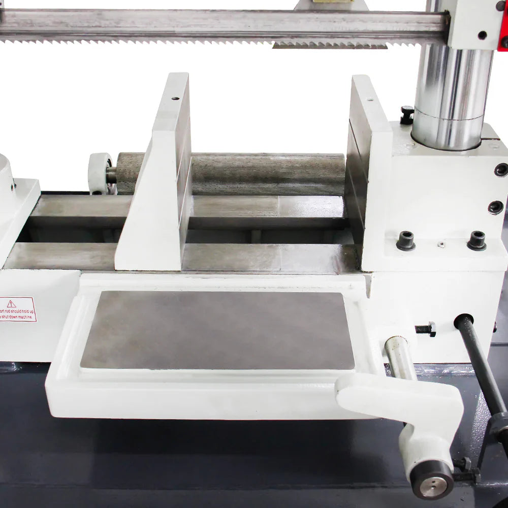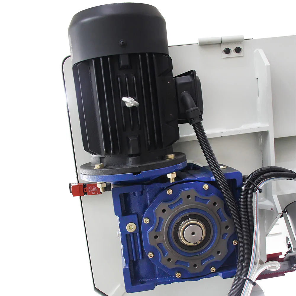 It runs on 230V power and is an industrial-grade double-column bandsaw. It uses a 2.2/2.8 kW double-speed motor to achieve two saw blade speeds of 45,69 m/min. Gear drive: The powerful motor provides the torque to drive the bandsaw blade through metal workpieces efficiently and accurately. This bandsaw can cut various materials, including metals, plastics, composites, wood, rubber, foam, ceramics, glass, and more.