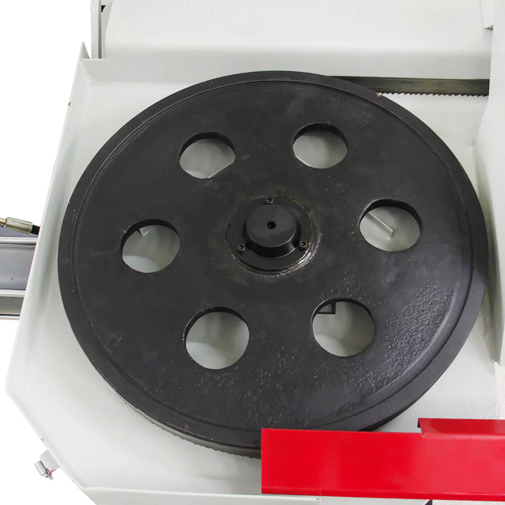 Hydraulic systems enhance safety by providing operators with reliable and responsive control over the cutting process. The band saw features a coolant system and an automatic shut-off setting. It also has a heat-treated high-carbon steel blade, brass fittings, and a full belt and blade guards complement.