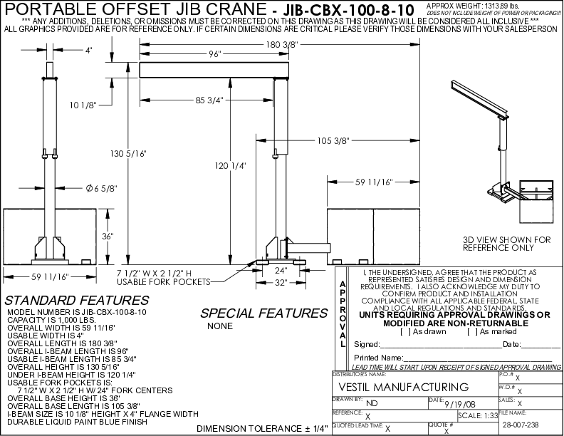 Vestil Steel Portable Offset Jib Crane with Empty Base 8 Ft. I-Beam 1000 Lb. Capacity Blue JIB-CBX-100-8-10