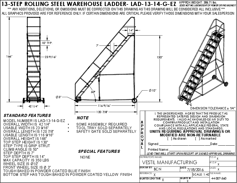 Vestil Steel Rolling Warehouse Ladder 50 Degree 13 Grip Strut 23-9/16 In. Step Width 350 Lb. Capacity Blue LAD-13-14-G-EZ