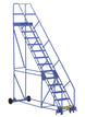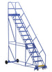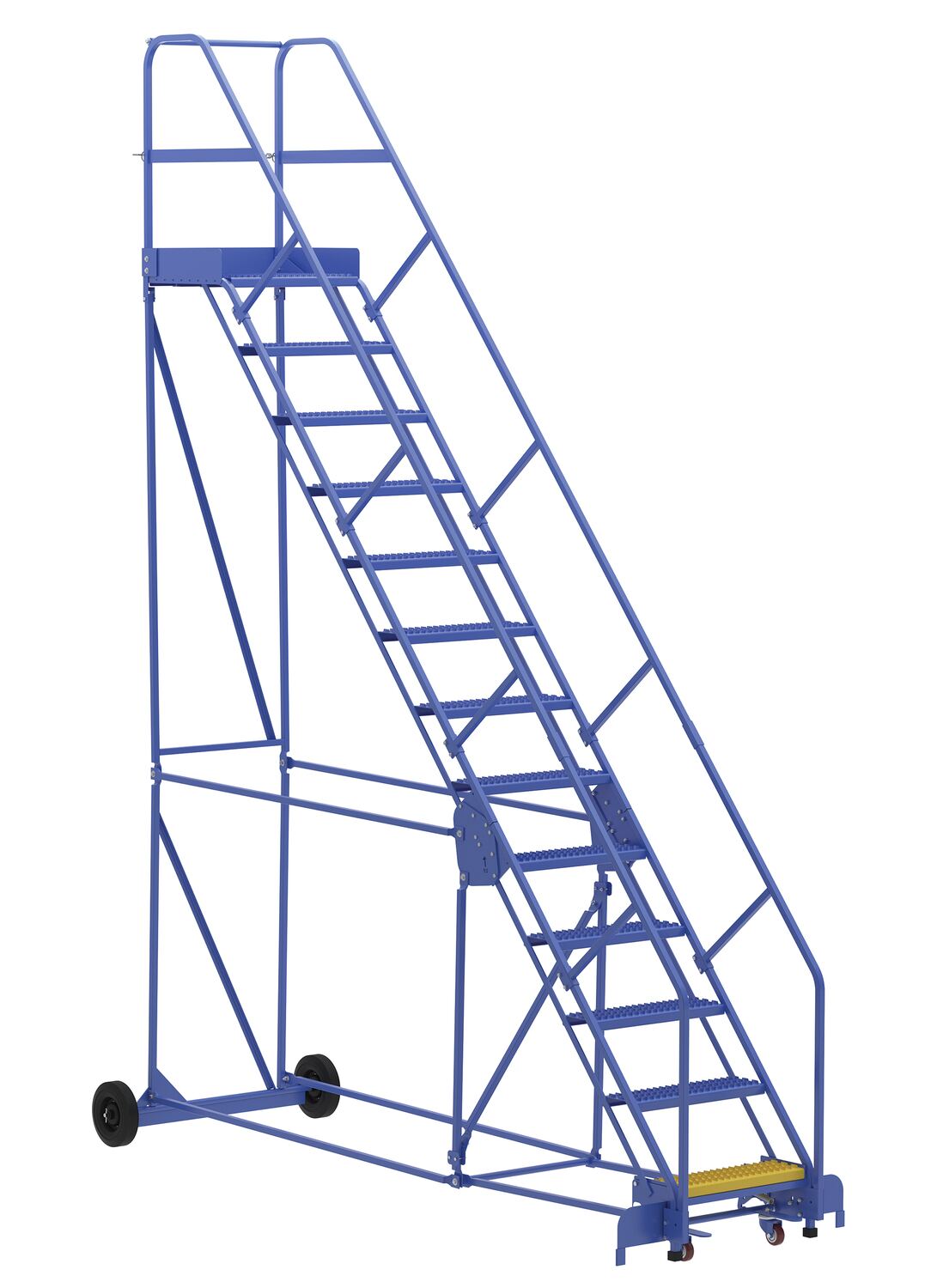 The rolling warehouse ladder is a great addition to material handling and shipping facilities. The powder coated steel construction maintains a strong, durable design throughout a lifetime of use. The steps include a perforated design and a 50 degrees climb angle that promotes stability while climbing and/or descending the ladder. The bottom step is colored yellow for additional safety and minimization of injuries when traversing the ladder with heavy loads.