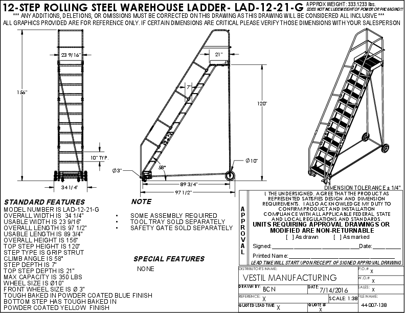 Vestil Steel Rolling Warehouse Ladder 58 Degree 12 Grip Strut 23-9/16 In. Step Width 350 Lb. Capacity Blue LAD-12-21-G