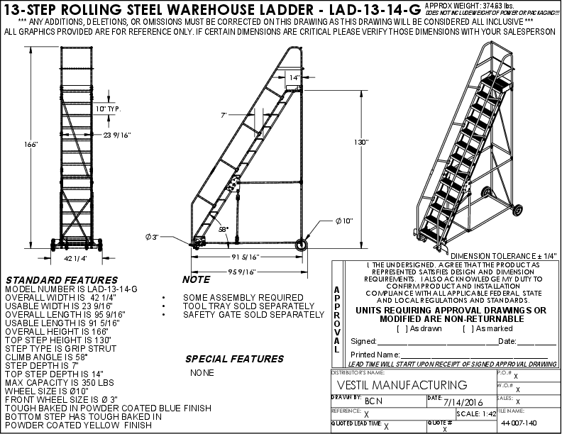 Vestil Steel Rolling Warehouse Ladder 58 Degree 13 Grip Strut 23-9/16 In. Step Width 350 Lb. Capacity Blue LAD-13-14-G