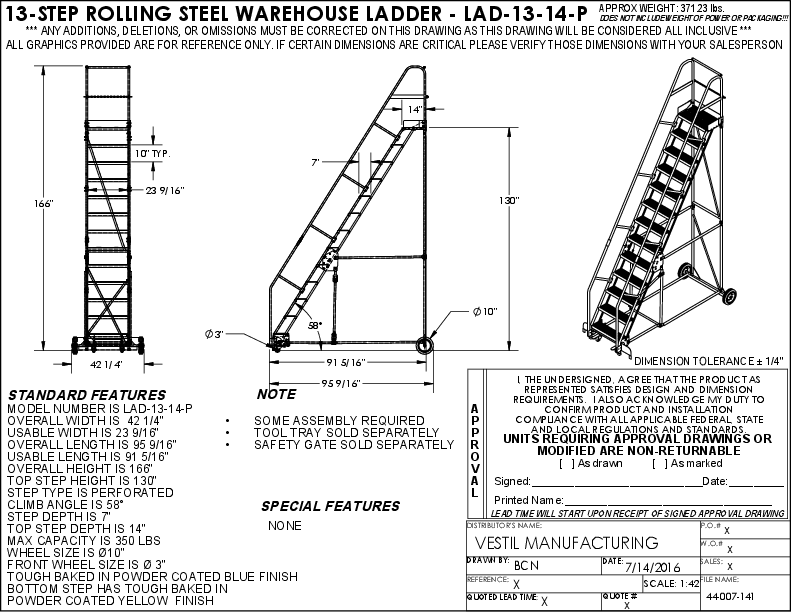 The rolling warehouse ladder is a great addition to material handling and shipping facilities. The powder coated steel construction maintains a strong, durable design throughout a lifetime of use. The steps include a grip strut design that promotes stability while climbing and/or descending the ladder. The bottom step is colored yellow for additional safety and minimization of injuries when traversing the ladder with heavy loads.