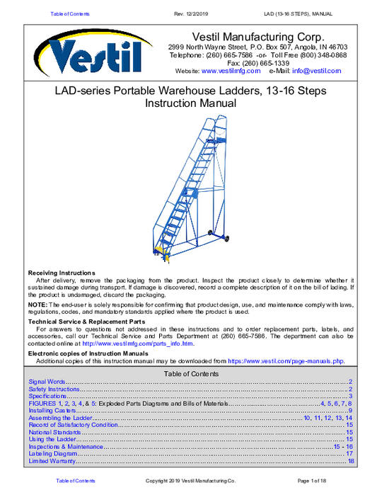 Vestil Steel Rolling Warehouse Ladder 50 Degree 13 Grip Strut 23-9/16 In. Step Width 350 Lb. Capacity Blue LAD-13-21-G-EZ