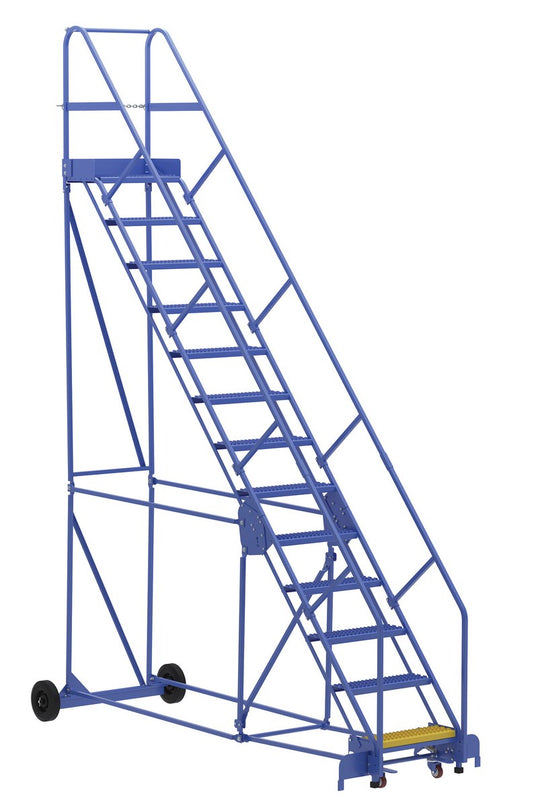 Vestil Steel Rolling Warehouse Ladder 50 Degree 13 Grip Strut 23-9/16 In. Step Width 350 Lb. Capacity Blue LAD-13-14-G-EZ