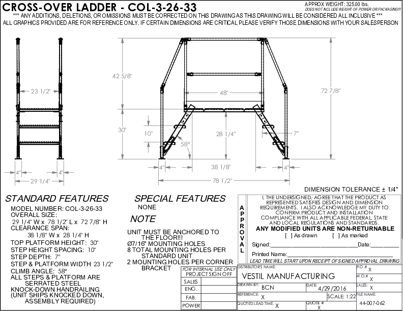 Vestil Steel Crossover Ladder 3 Step 23-1/2 In. x 48 In. 500 Lb. Capacity Yellow COL-3-26-33