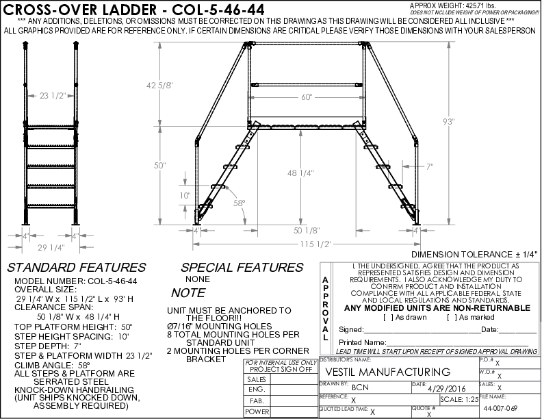 Vestil Steel Crossover Ladder 5 Step 23-1/2 In. x 60 In. 500 Lb. Capacity Yellow COL-5-46-44