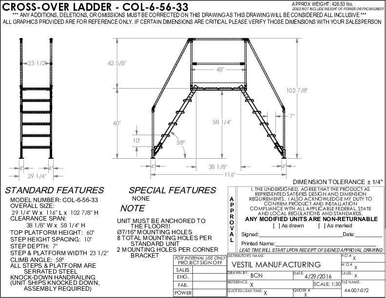 Vestil Steel Crossover Ladder 6 Step 23.5 In. x 48 In. 500 Lb. Capacity Yellow COL-6-56-33