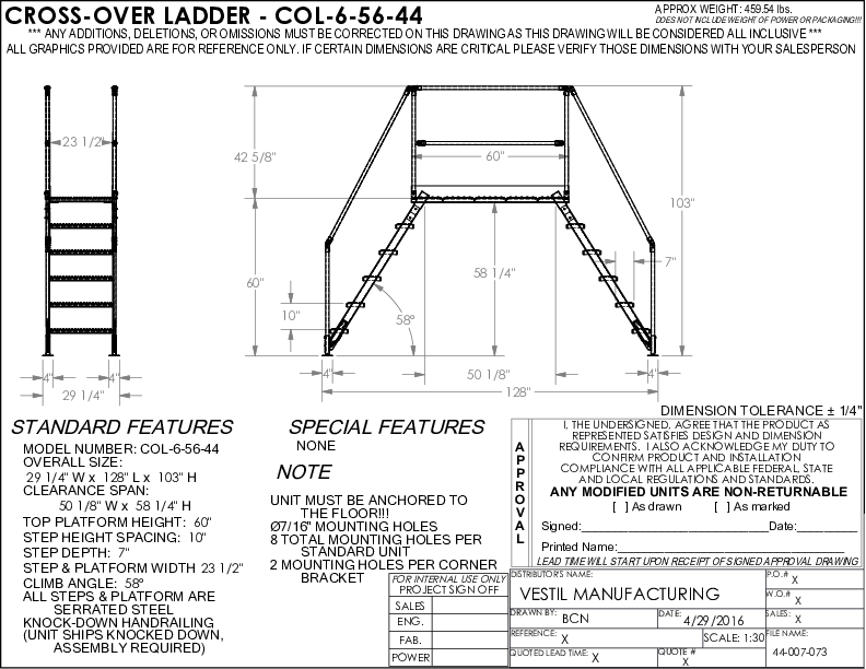 Vestil Steel Crossover Ladder 6 Step 23.5 In. x 60 In. 500 Lb. Capacity Yellow COL-6-56-44