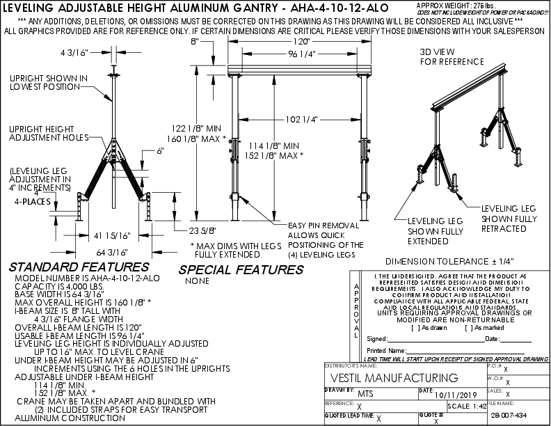 • Height and leveling adjustments can be completed with support from fork truck or other overhead lifting device
