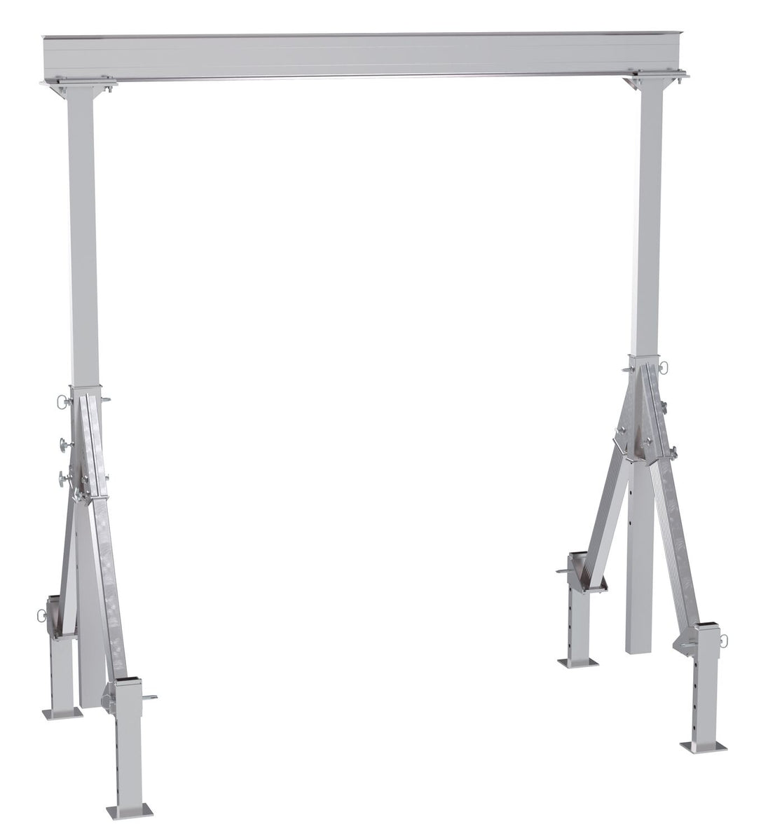 An adjustable height aluminum gantry crane is a valuable asset in warehousing and manufacturing settings. The crane has an all-aluminum construction making it corrosion resistant and perfect for outdoor use. All pinned connections make it possible for personnel to set up and take down in just minutes. The adjustable leveling legs allow the crane to be raised or lowered in 4" increments on uneven surfaces. Each leg has a pin style adjustment design with pre drilled alteration holes. With a rectangle shaped base included on each leg, the crane has a strong foundational support.