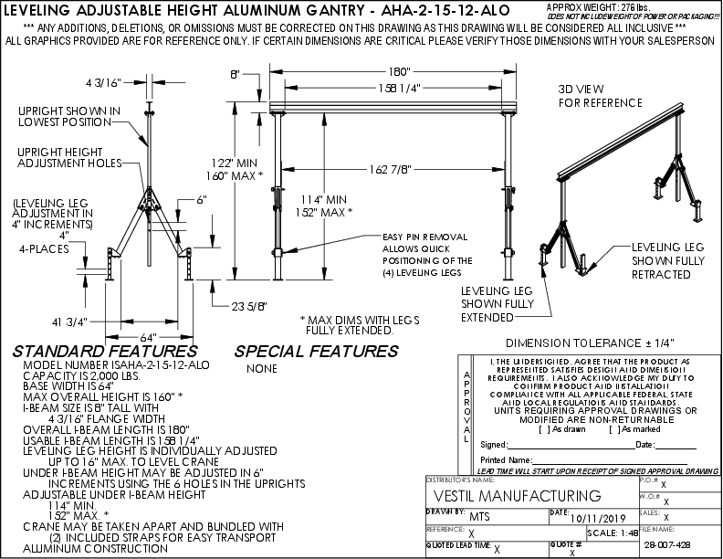 Vestil Aluminum Adjustable Height Gantry Crane With Adjustable Leveling Option 15 Ft. Wide X 12 Ft. Max Usable Height 2,000 Lb. Capacity Silver AHA-2-15-12-ALO