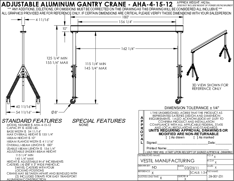 Vestil Aluminum Adjustable Height Gantry Crane with Phenolic Casters 15 Ft. Wide x 12 Ft. Max Usable Height 4,000 Lb. Capacity Silver AHA-4-15-12
