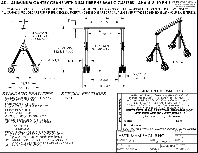 The adjustable height Aluminum Gantry crane combines a lightweight, rigid, and sturdy construction into one unit. The all aluminum construction of this gantry crane makes it corrosion resistant and perfect for outdoor use. Included are two (2) straps, allowing the gantry crane to be transported in one neat package.