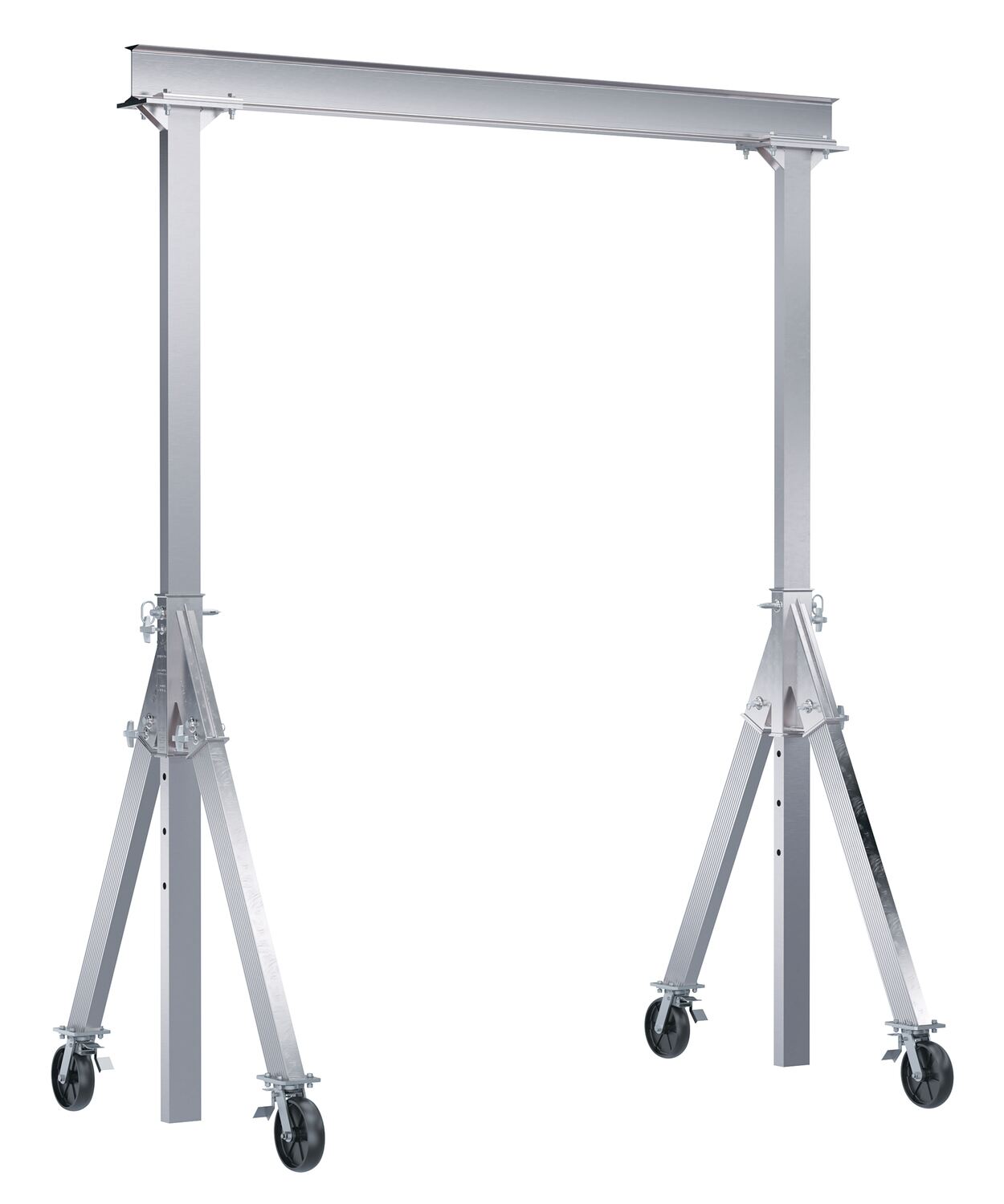 The adjustable height Aluminum Gantry crane combines lightweight and rigid, sturdy construction into one unit. The all aluminum construction of this gantry crane makes it corrosion resistant and perfect for outdoor use. The lightweight I-beam allows simple height adjustments. All pinned connections make it possible for single person set up and take down in just minutes. Included are two straps, allowing one person to transport the gantry crane in one neat package. Unit comes standard with total locking casters.