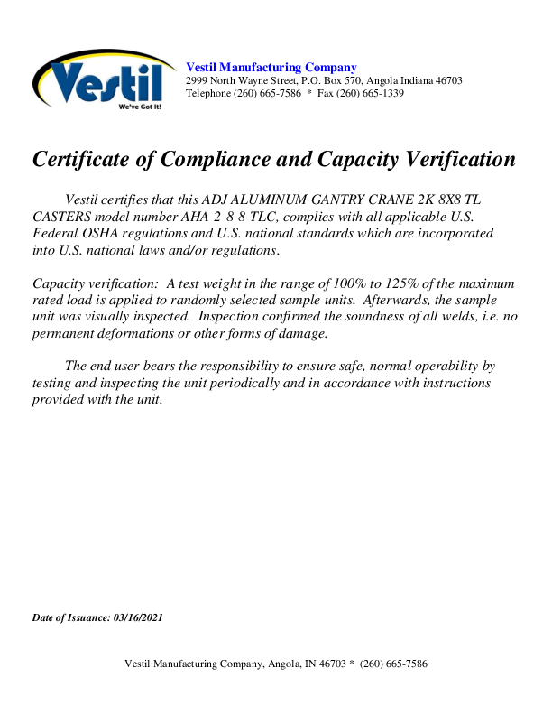 The adjustable height Aluminum Gantry crane combines lightweight and rigid, sturdy construction into one unit. The all aluminum construction of this gantry crane makes it corrosion resistant and perfect for outdoor use. The lightweight I-beam allows simple height adjustments. All pinned connections make it possible for single person set up and take down in just minutes. Included are two straps, allowing one person to transport the gantry crane in one neat package. Unit comes standard with total locking casters.