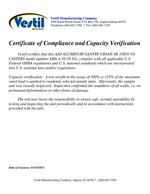 Vestil Aluminum Adjustable Height Gantry Crane with V-Groove Ductile Steel Casters 10 Ft. Wide x 10 Ft. Max Usable Height 4,000 Lb. Capacity Silver AHA-4-10-10-VG