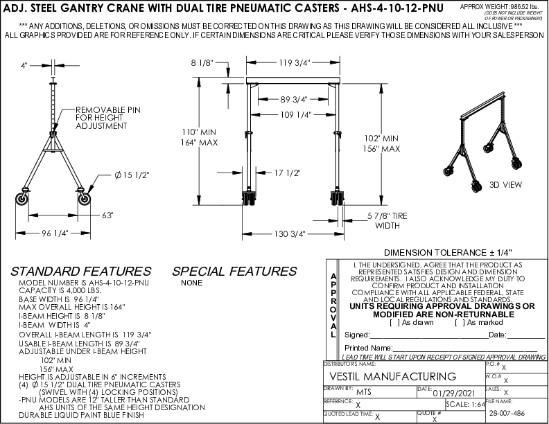 Vestil Steel Adjustable Height Gantry Crane with Pneumatic Rubber Casters 10 Ft.Wide x 12 Ft. Max Usable Height 4,000 Lb. Capacity Blue AHS-4-10-12-PNU