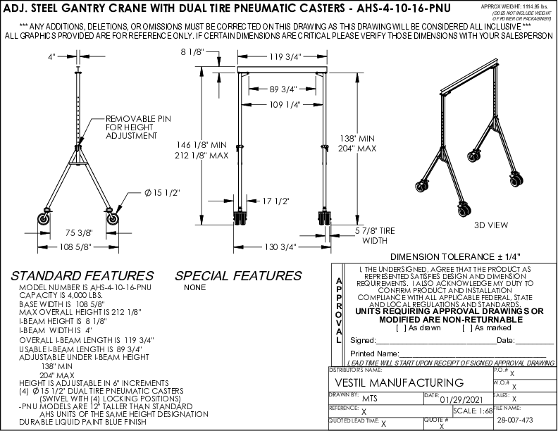 Vestil Steel Adjustable Height Gantry Crane with Pneumatic Rubber Casters 10 Ft.Wide x 16 Ft. Max Usable Height 4,000 Lb. Capacity Blue AHS-4-10-16-PNU