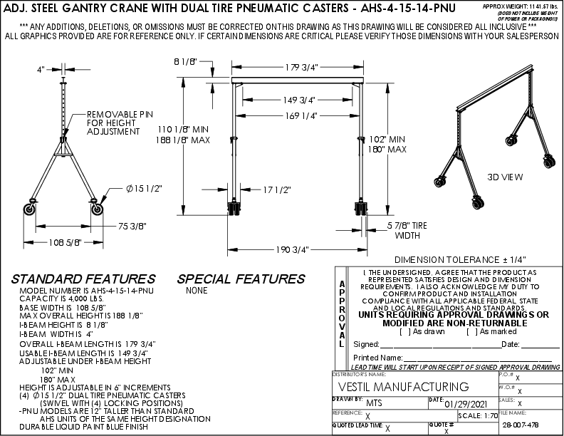 Vestil Steel Adjustable Height Gantry Crane with Pneumatic Rubber Casters 15 Ft.Wide x 14 Ft. Max Usable Height 4,000 Lb. Capacity Blue AHS-4-15-14-PNU