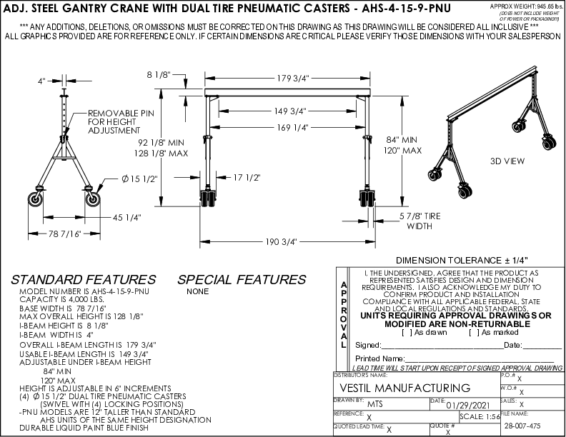 Vestil Steel Adjustable Height Gantry Crane with Pneumatic Rubber Casters 15 Ft.Wide x 9 Ft. Max Usable Height 4,000 Lb. Capacity Blue AHS-4-15-9-PNU