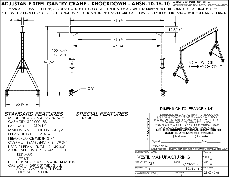 Vestil Steel Knock-Down Adjustable Height Gantry Crane with Ductile Steel Casters 15 Ft.Wide x 10 Ft. Max Usable Height 10,000 Lb. Capacity Blue AHSN-10-15-10