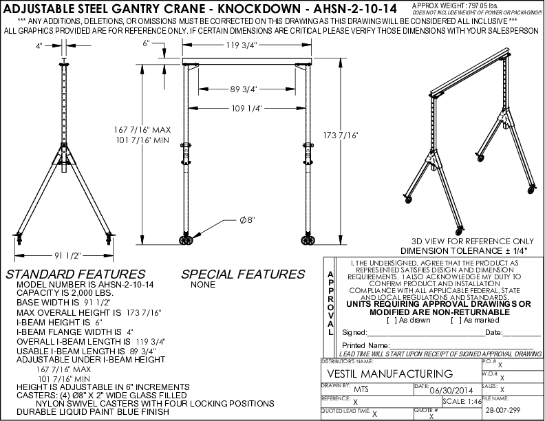 Vestil Steel Knock-Down Adjustable Height Gantry Crane with Glass Filled Nylon Casters 10 Ft.Wide x 14 Ft. Max Usable Height 2,000 Lb. Capacity Blue AHSN-2-10-14