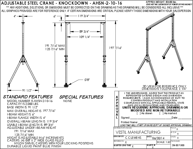 Vestil Steel Knock-Down Adjustable Height Gantry Crane with Glass Filled Nylon Casters 10 Ft.Wide x 16 Ft. Max Usable Height 2,000 Lb. Capacity Blue AHSN-2-10-16