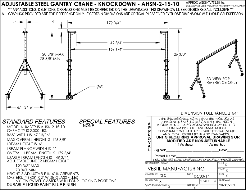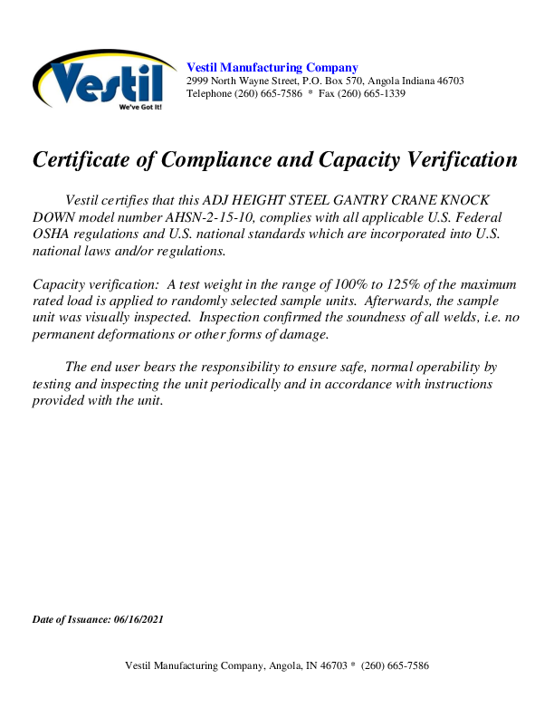 Vestil Steel Knock-Down Adjustable Height Gantry Crane with Glass Filled Nylon Casters 15 Ft.Wide x 10 Ft. Max Usable Height 2,000 Lb. Capacity Blue AHSN-2-15-10