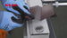Hit the foot pedal that softly clamps the material. This foot control keeps your fingers safely out of the machine and you to reposition the material.