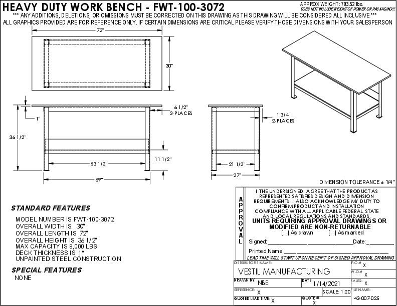 Vestil Steel Fixture Welding Table with 1 In. Thick Top 30 In. x 72 In. x 36-1/2 In. 8000 Lb. Capacity Bare FWT-100-3072