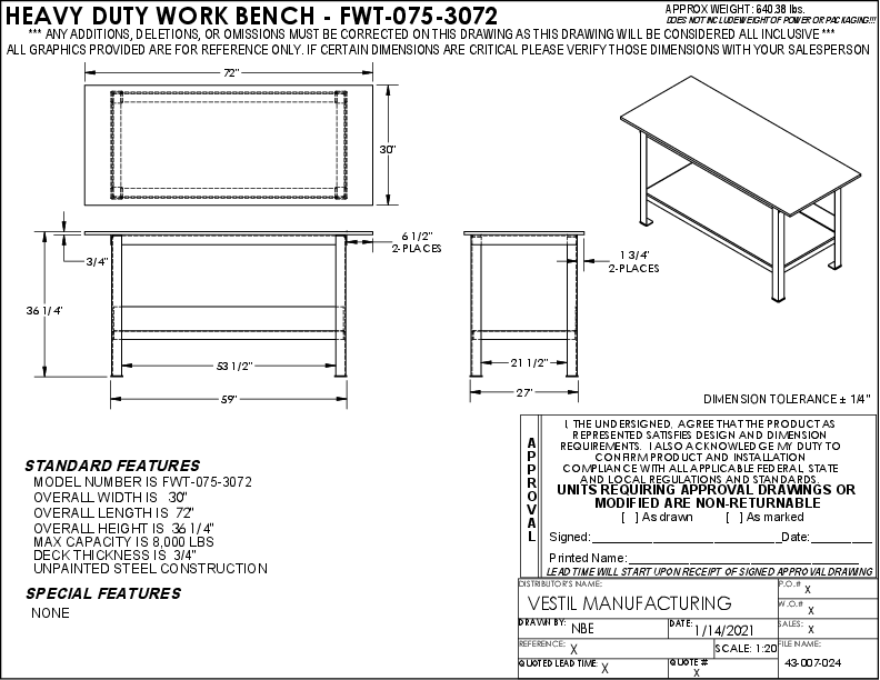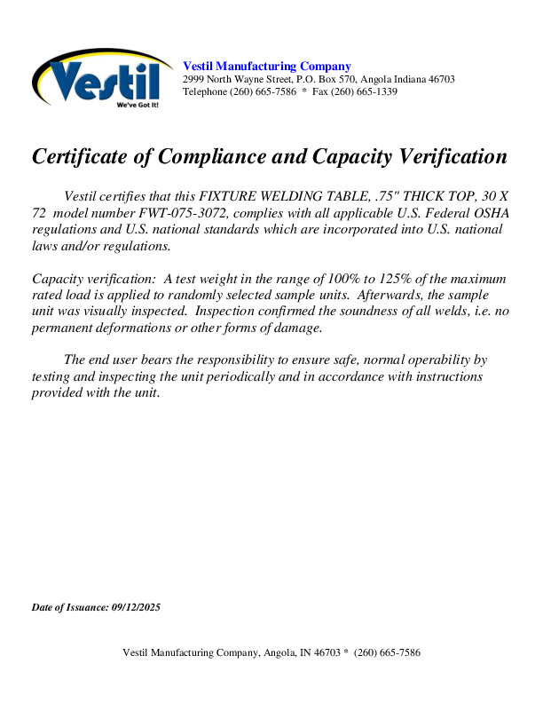 Vestil Steel Fixture Welding Table with 3/4 In. Thick Top 30 In. x 72 In. x 36-1/4 In. 8000 Lb. Capacity Bare FWT-075-3072