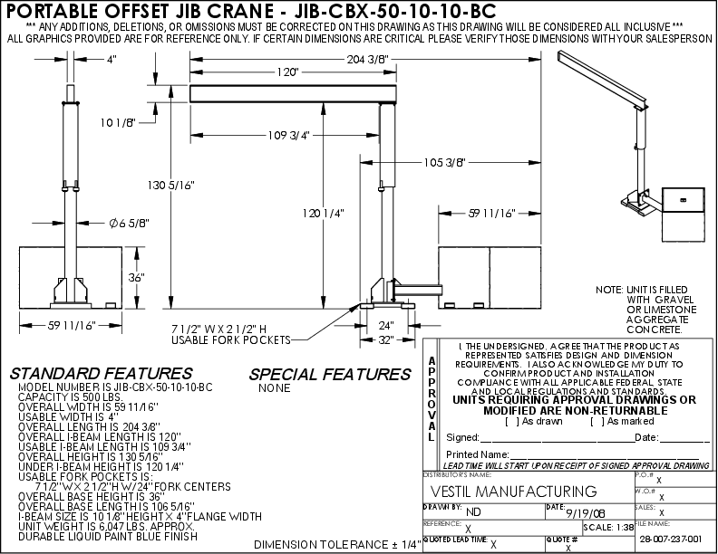 Vestil Steel Portable Offset Jib Crane with Filled Base 10 Ft. I-Beam 500 Lb. Capacity Blue JIB-CBX-50-10-10-BC